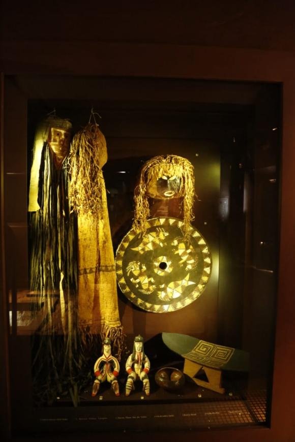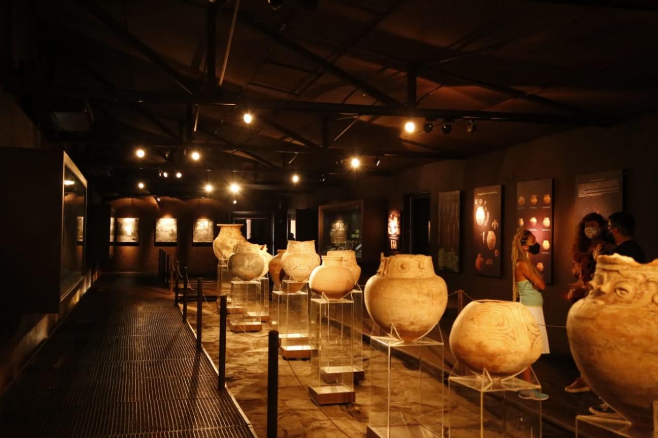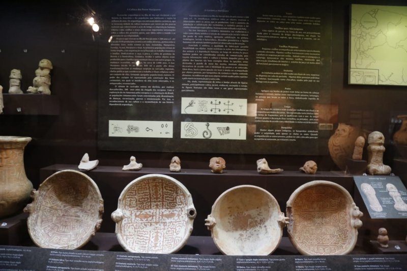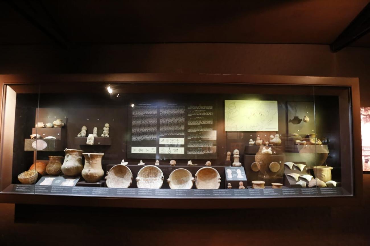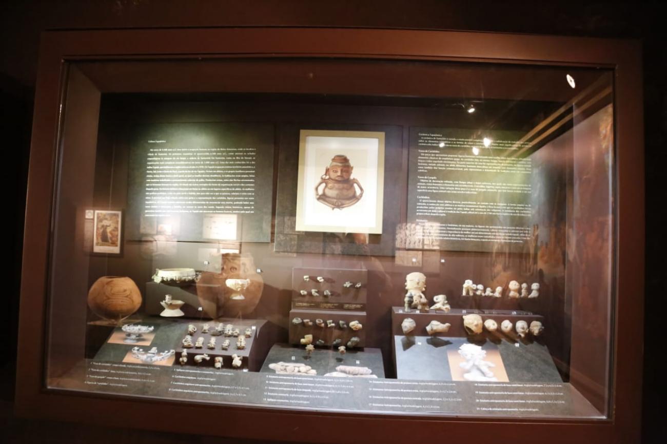 A exposição na sala Guaimiaba aborda em sua temática expositiva um rico acervo da arqueologia pré-contato, que inclui lâminas de machados, raspadores, muiraquitãs e as bem conhecidas cerâmicas das culturas Marajoara e Tapajônica. Também estão expostas a cultura material relativa à arqueologia histórica, como artefatos militares, botões de fardamento, medalhas, louças, garrafas de grés e de vidro, moedas e outros objetos do cotidiano.