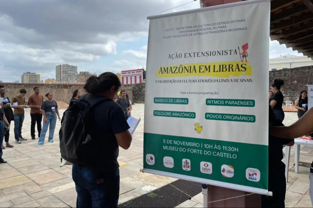 Participantes aprendem o básico de Libras no Forte do PresépioA ação extensionista “Amazônia em Libras” aproxima o universo da Língua Brasileira de Sinais (Libras) da sociedade, através de atividades lúdicas e troca de experiências entre alunos do curso de Letras com habilitação em Libras, da Universidade Federal do Pará (UFPA), e a comunidade local. A Secretaria de Estado de Cultura do Pará (Secult) apoia o projeto que realizou a sua segunda edição na manhã desta quarta-feira (5), no Forte do Presépio. A temática dessa edição contemplou a cultura amazônica, pautando a valorização da cultura através da língua de sinais.